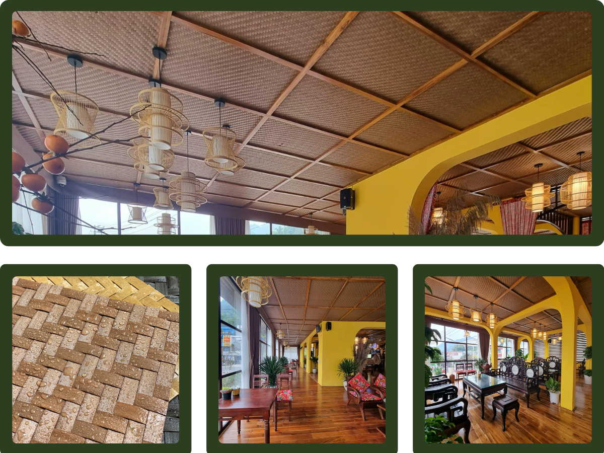 | Ứng dụng | Tường, trần, hậu cảnh, quầy bar | Lam tre, khung mái, cột trụ |