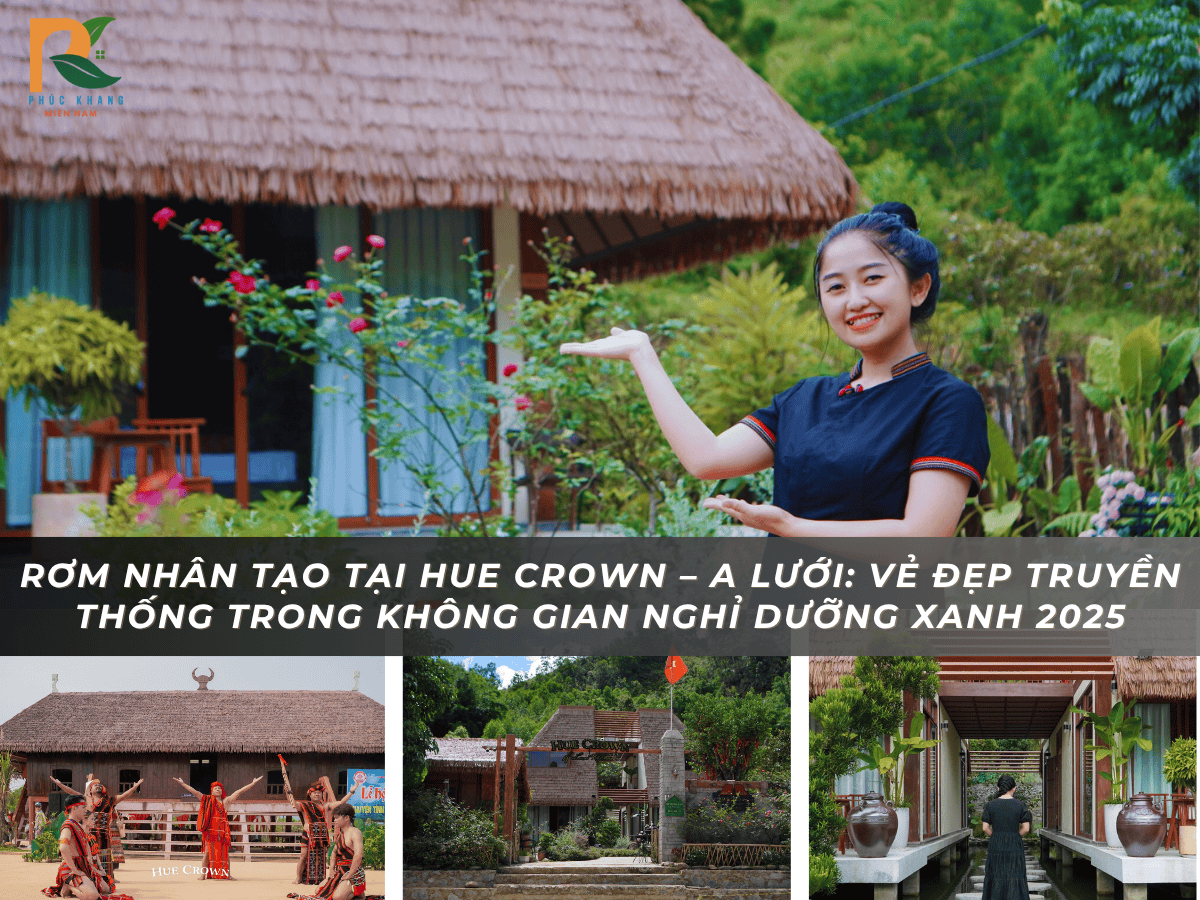 Hue Crown – A Lưới là một trong những điểm đến sinh thái nổi bật tại Thừa Thiên Huế, nơi hội tụ tinh hoa văn hóa miền sơn cước cùng lối kiến trúc gần gũi với thiên nhiên. Trong quá trình kiến tạo không gian nghỉ dưỡng, rơm nhân tạo đã được lựa chọn thay thế cho mái tranh truyền thống, mang đến sự kết hợp hoàn hảo giữa vẻ đẹp mộc mạc và độ bền hiện đại.